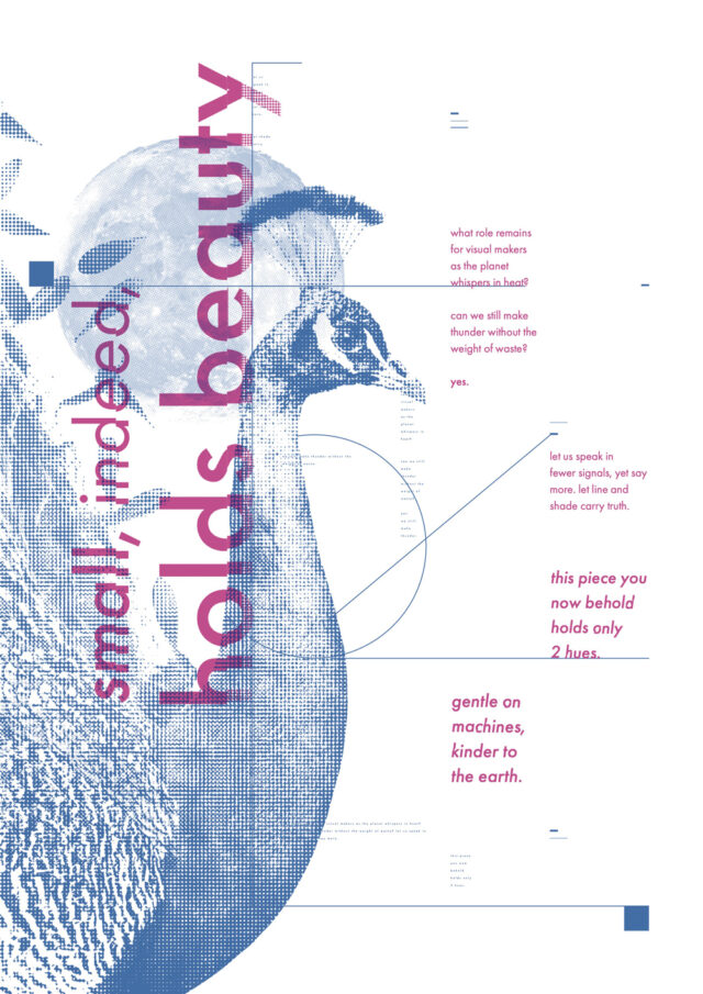 Dua karya ini merupakan poster berseri yang dibuat dengan menerapkan prinsip desain lestari serta menggabungkan beberapa bahasa visual yaitu surealistik dan konstruktivistik. Salah satu strategi kelestarian yang digunakan adalah dengan meminimalkan penggunaan warna dan tinta. Tajuk tipografis “Small, indeed, holds beauty” bermaksud menunjukkan bahwa meskipun warna dan tinta digunakan terbatas, suatu karya tetap dapat tampil indah dan bermakna. Pada karya pertama, makna “beauty” divisualkan melalui seorang penari balet bersayap yang menunjukkan keanggunan dan keindahan gerak tubuhnya. Sementara pada karya kedua, digambarkan sosok burung merak (simbol kecantikan) dengan lengkungan tubuhnya yang indah serta bulu-bulunya yang menjelma menjadi kelopak bunga di bawah bulan. Makna “small” lebih ditekankan pada penerapan desain berkelanjutan melalui penggunaan grafik halftone. Warna pink pada karya melambangkan “beauty” sedangkan warna biru menyampaikan pesan emosional yang positif dengan tujuan mendukung upaya memperbaiki kondisi bumi menjadi lebih ramah lingkungan.