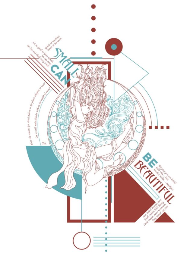 Karya poster ini berupaya memadukan kecantikan dengan kelestarian, dua hal yang tidak otomatis terkoneksi. Grafis cantik masa kini kerap identik dengan grafis resolusi ultra tinggi dan ‘mengkilap’ (barangkali seperti grafik hasil render AI), sementara grafis lestari identik dengan kesan ‘tanah’ dan ‘kumal’ bahan-bahan daur ulang. Menghindari dua klise tersebut, sumber rujukan kecantikan poster ini adalah bahasa visual tradisional Art Nouveau, namun dibentuk ulang dengan komponen digital kekinian yaitu grafik vektor yang efisien secara ukuran berkas. Untuk meminimalisasi tinta pada saat dicetak, grafik didominasi oleh outline halus dengan palet warna hanya dua: biru-hijau dan merah kecoklatan. Komposisi keseluruhan dan elemen-elemen penunjang yang geometrik ikut membangun kesan kekinian aset visual utama, yakni ilustrasi perempuan berpose gimnastik ritmik yang secara gaya diinspirasi Art Nouveau tradisional.