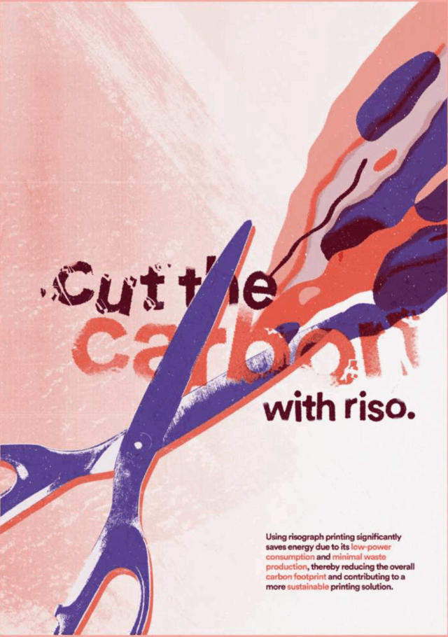 Dua karya poster yang mempromosikan risografi ini dicetak dengan teknik / media risografi yang lebih ramah lingkungan dibandingkan dengan laser atau offset. Meskipun demikian, risografi memiliki batasan atau kekhasan hasil cetaknya, yaitu menggunakan sedikit warna (spot color) dan memiliki tekstur acak yang menonjol. Agar tujuan desain mempromosikan risografi dapat lebih mampu menarik dan mengajak pemirsa, perlu ditempuh strategi desain tertentu. Strategi jocelyn adalah mendahulukan copywriting yang kuat, lalu mengkonversi pesan verbal tersebut menjadi komposisi tipografis yang dipadukan dengan gambar. Pada poster pertama, strategi visual yang ditempuh adalah pemisahan antara tipografi (yang berbunyi “think green, print clean, with riso”) yang ditata dengan grid, dengan gambar berupa montase dinamis antara figur manusia dan pepohonan. Hasi yang diharapkan dari komposisi ini adalah pesan verbal-denotatif terbaca dengan jelas, sementara gambar memperkuat pesan tersebut dengan konotasi visual. Pada poster kedua, strategi komposisi yang ditempuh adalah peleburan antara tipografi (yang berbunyi “cut the carbon with riso”), dengan gambar gunting dan obyek abstrak yang menggambarkan aliran emisi. Peleburan ini diharapkan dapat membuat pesan verbal (“cut the carbon”) tampil jauh lebih kuat karena dileburkan dengan pesan visual yakni gunting yang memotong aliran emisi. Efek visual secara keseluruhan juga mengoptimalkan cetak dua warna dan bertekstur khas risografi.