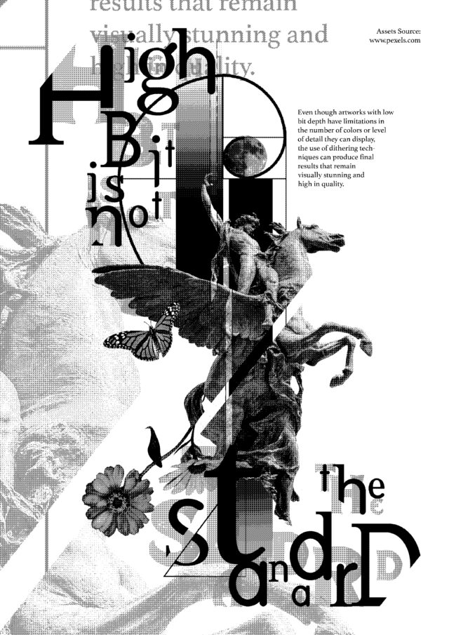 Dalam grafik komputer, dithering adalah operasi pemrosesan gambar yang digunakan untuk menciptakan ilusi kedalaman warna pada citra dengan palet warna terbatas. Warna yang tidak tersedia dalam palet didekati dengan penyebaran piksel banyak warna tersebut ke dalam palet sedikit warna. Lewat proses dithering, citra digital 24 bit (16,7 juta warna) misalnya, bisa direduksi menjadi citra 8 bit (256 warna), atau 4 bit (16 warna), atau bahkan 1 bit (1 warna) tanpa terlalu kehilangan kesan kedalamannya. Efek ramah lingkungan metode dithering menjadi jelas juga: ukuran citra digital menjadi lebih kecil dan ringan bagi proses komputasi, menjadikan komputasi lebih hemat energi dan ramah lingkungan. Namun bagi Audrey, pengalaman bekerja dengan dithering bukan hanya perkara menerapkan teknik, namun sekaligus eksperimentasi pencerapan inderawi. Disebut eksperimen pencerapan inderawi karena kegiatan (mempersepsi visual) tersebut bukan terjadi pada saat karya selesai, melainkan justru harus terus menemani atau berlangsung dalam percobaan demi percobaan mencari efek dithering yang ‘indah.’ Akhirnya, walaupun dalam low bit depth, karya dithering tetap dapat terlihat memukau dan cantik. Dengan kualitas rendah pun, karya dithering tetap dapat memenuhi, bahkan melebihi ‘standar’ dalam desain. Ramah lingkungan memang tidak harus berakhir dengan miskin rupa, sejauh desainernya mau bereksplorasi dan mencari.